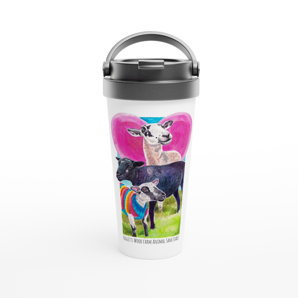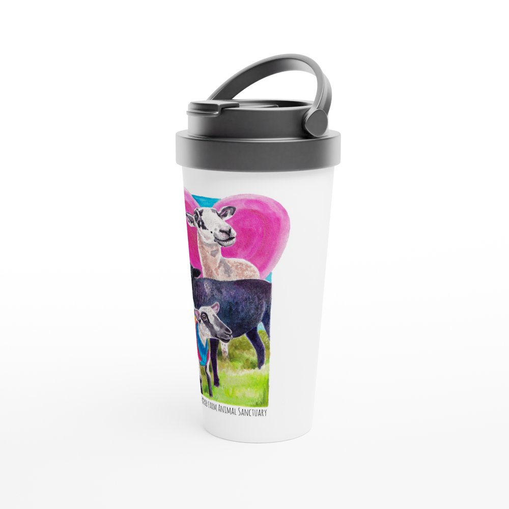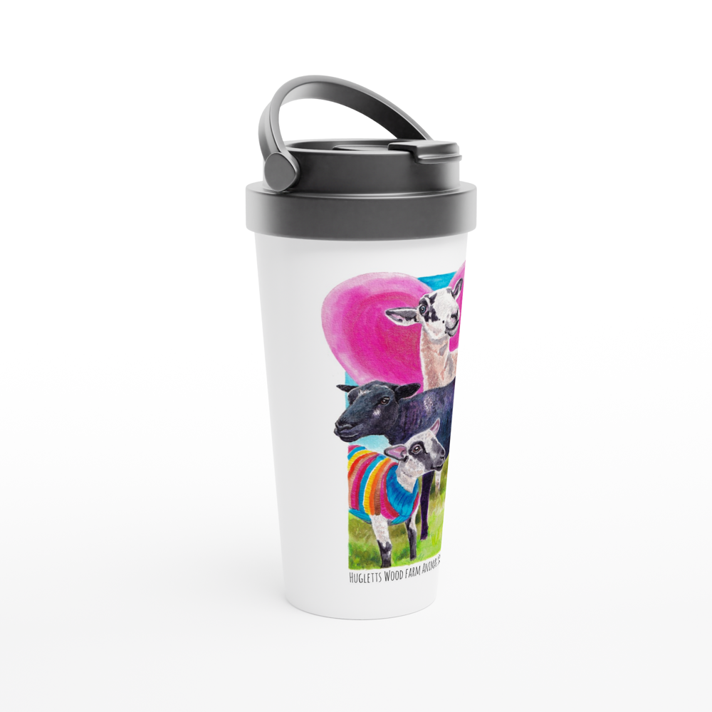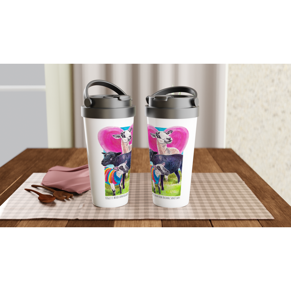Spread joy with our Charity Travel Mug, featuring a charming watercolour illustration of three rescue sheep. Sam, Charlie, and Dorothy are three rescue sheep who are lucky to be able to call Hugletts Wood home.
