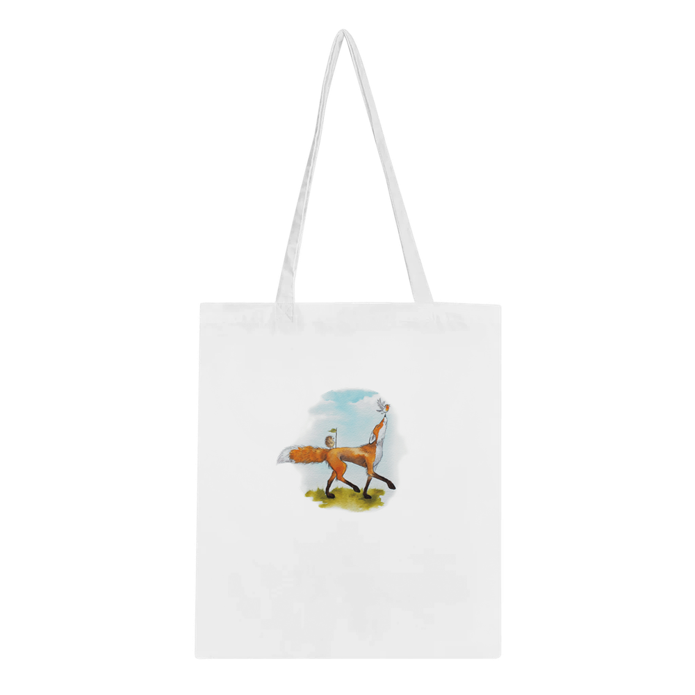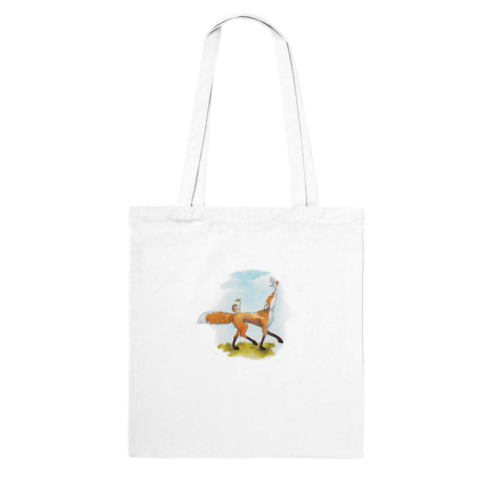 This tote bag features a whimsical watercolour illustration of Fox and his friends, Hedgehog and Robin.