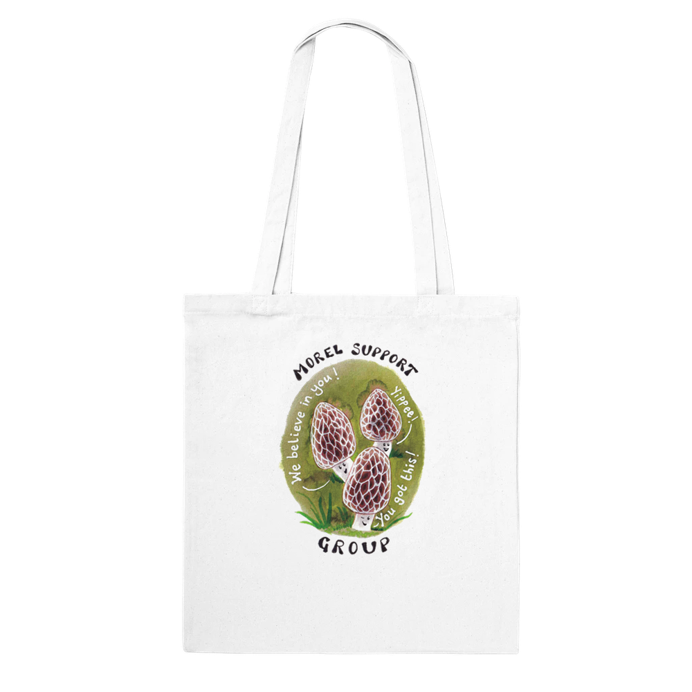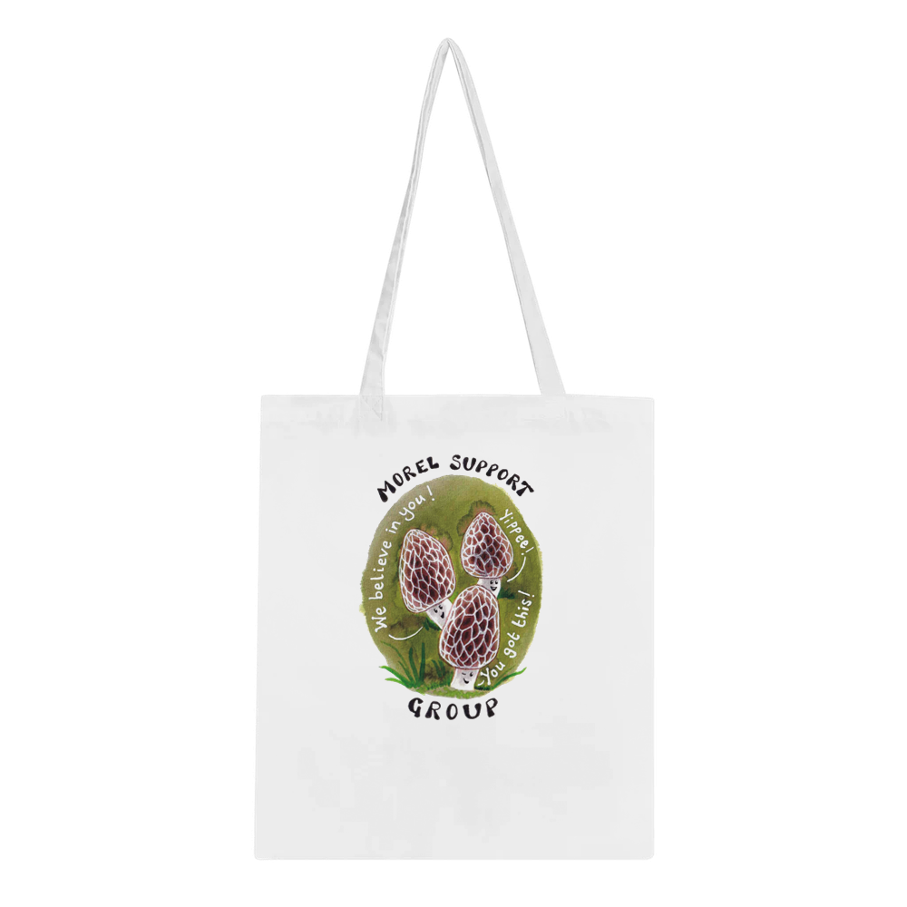 Spread positivity with my Morel Support Group bag! Featuring a whimsical watercolour illustration of cheeky morel mushrooms, this uniquely designed tote is perfect for cheering on your loved ones. Perfect for spreading love and moral support.